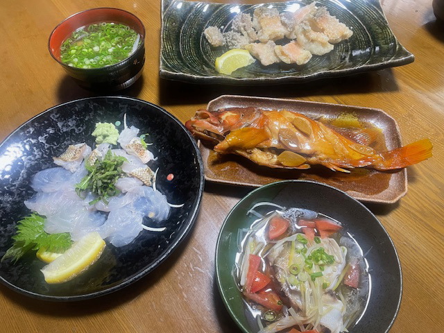 ![]() 刺身、松笠揚げ、吸い物、頭は酒蒸しと先日釣ったアカハタの煮つけの夕食。 シロアマダイは鱗付き皮の素揚げと刺身が最高に旨かった!! |