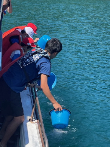 ☆ 今年も暑い中、地元西海小学校5年生の協力のもと真鯛の稚魚放流を行いました。