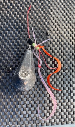 ![]() 初白アマダイ仕掛けです。基本タイラバ仕掛けですが、 ヘッドにはナス型50号ナマリを使っています。 200g近く重さがあることと形が海底にぬかり易いことがメリットです。 |