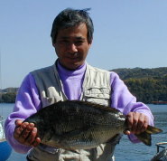 久米さんは中瀬4番で3.9kgの良型です。(本当は奥様が釣った?) | 今年の打率100%の副島さんは大立西の北で大漁でした。一番の大物は4.8gkでした。 |