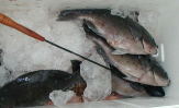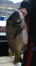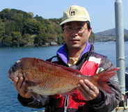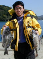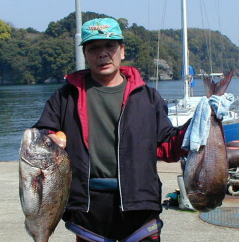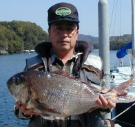 | 初挑戦高浪さんが釣ったのは3.3kgの美味しいそうマダイ。ポイントは高瀬?番。 | 美崎さんは得意の西瀬4番でクロ1.3kg、マダイ2.8kg他とナイスな釣果でした。 | 副島さんのチヌです。 2.75kgはデカイ! |