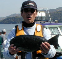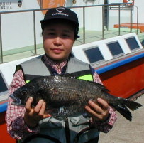 | みごと6.5kgを釣り上げた柴田さんです。雨のなか良く頑張りました。ポイントは中瀬4番です。 | 同じく中瀬4番で3.7kgを釣った八尋さんです。 |