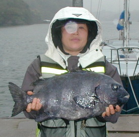 これまた、ビックリ。大立カイダンにイシダイがいるなんて・・・。久米さん(奥様)が地球と勘違いしたほどの大物でした。イシダイ4.6kg(55cm)は今期最高。ちなみに三号竿、五号ハリスの上物仕掛けにかかった幸でした。 |