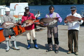 そろって5kg以上を釣った 名人達です。 左から井上さん、山野さん 川田さん、本田さんです。 井上さん、川田さん、本田さんはそれぞれ15kg以上のお魚を ゲットしていました。 |