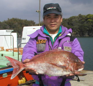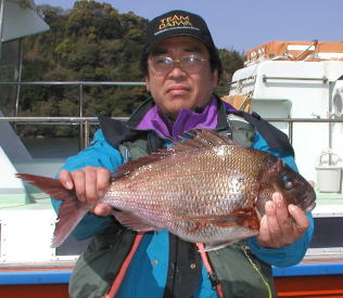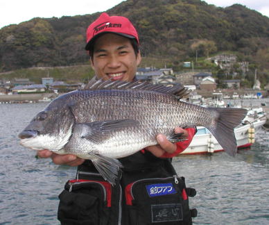 | マダイの部、クロの部共に優勝した木浦さんです。 マダイ3.1kg、クロ2.0kgでした。 ポイントは小立島東 |