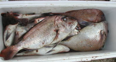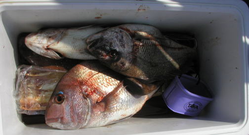 ![]() 本田さんのクーラー マダイに混じってクロが10枚ほど入っています。 |