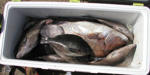 | 大立島西のハナの本田さんのクーラーです。相変わらずの大漁。クロも10枚ほど入っていました。 |