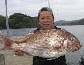 | 清原さんが自己新の6kgを釣りました。ポイントは中瀬3番、夜中の潮止まり直前だったそうです。 | 川口さんは写真の5.5kgを筆頭に3.9kg以下多数のマダイをゲット。ポイントはもちろん小立島西のワレです。 |