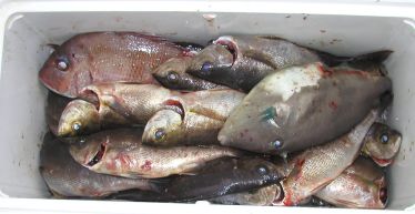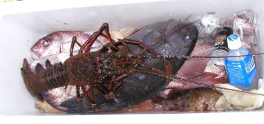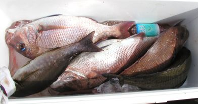 東から南の東へ歩いていった人がマダイ、クロそしてイセエビまで釣っていました。マダイの数が