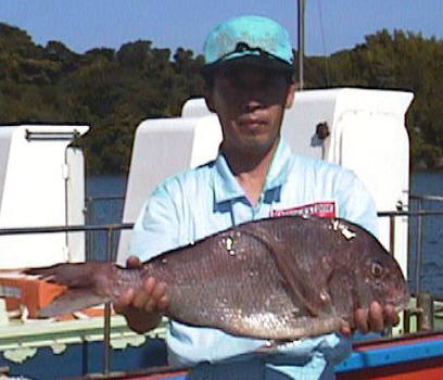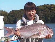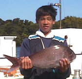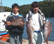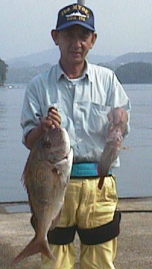 これまた西口さんの息子の祐輔君も2.6kgのマダイをゲット。きっと自己記録でしょう。 | 親子そろってのスナップです。 お父さんはマダイ2枚の釣果です。 |