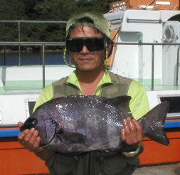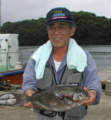 | 吉田さんが大立東ハナレで釣ったキロオーバーのクロです。ウネリに負けず好釣しました。 | 久々にチャレンジした千々岩さん。1.7kgの大物を小立東で釣りました。立派なクチブトです。 |
