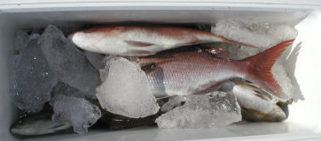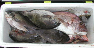 高瀬3番で釣った井上さんのクーラーです。イサキとマダイがはいっていました。 |