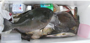 | 本田さんは大立南で4枚の良型クロを釣っていました。一番大きなものは1.4kgです。 | 本田さんのクーラーです。マダイも2.7kgありました。 |