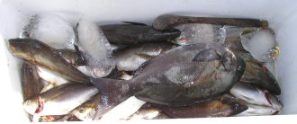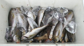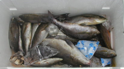 高瀬1番の米村さんのクーラーです。 スズキに混じってイサキがいますが、型が小さくなってきました。 |