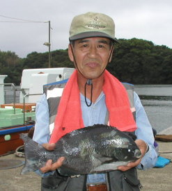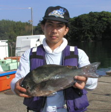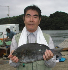 | 村上さんは広場でマダイを釣ってニンマリです。 | 中山さんのクロは1.5kgでした。大立東のハナレです。 |
