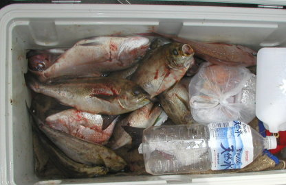 大立東の北で釣った 千住さんのクーラーです。 良型のイサキと食べごろマダイがたくさん入っていました。 これからは大立が良くなってくるでしょう。 |
