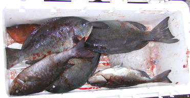 | 久米さんのクーラーです。全部奥様が釣ったそうです。脱帽・・ | 今週も一番重かった本田さんのクーラーです。大立島西のハナでマダイ、クロ他大漁でした。 |