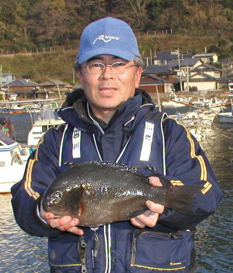 | 久米さんはクロの自己記録更新の1.8kgを釣りました。ポイントは大立島船泊まり、タモマンはご主人です。 | 江口さんも1.8kぐぉ大立島南でゲット。みごとな地グロです。 |