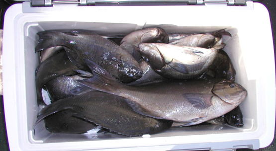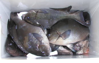 | 力武さんが小立島西のワレで釣った1.3kgです。 | 高瀬1番上滝さんのクーラーです。下げ潮が良かったそうです。 |
