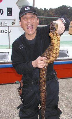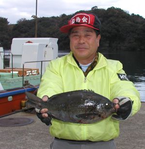 狙ったかどうかは定かではありませんが、キビナゴで3.8kgのうつぼを釣り上げた大西さんです。 |