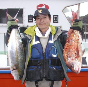 中瀬1番で3.5kgのヒラスと良型マダイを釣った吉富さん。 |