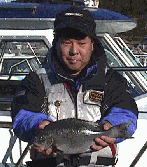 本田さんが釣ったオスの奥様でしょうか。 これも5.0kgの大物です。 本田さんのとなりで釣りました。 釣り人はいつもの川田さんです。 |