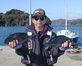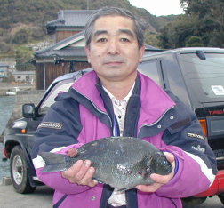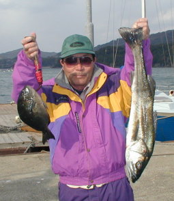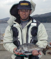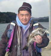 | 藤原さんは小立東で7枚のクロを釣っていました。前にあるハナレに渡る道板をもってきた努力が実りました。 | 船津さんはチヌ2枚とマダイをゲット。ポイントは高瀬2番です。 |