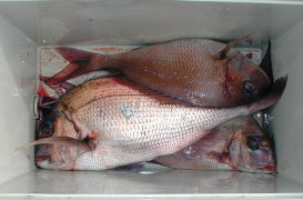 | 坂井さんは高瀬2番でマダイを4枚釣っていました。いよいよ桜ダイの季節が始まります。 | これまたみごとにマダイばかりのクーラーでした。 |