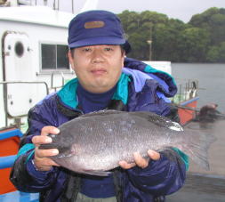 | 1番のマダイは下釜さんが釣りました。7.3kgをカイダンでゲット。 | クロの1番は今村さんが釣った2.05kgです。ポイントは小立島南の東1番です |