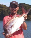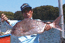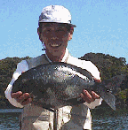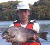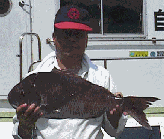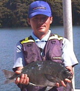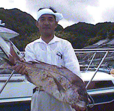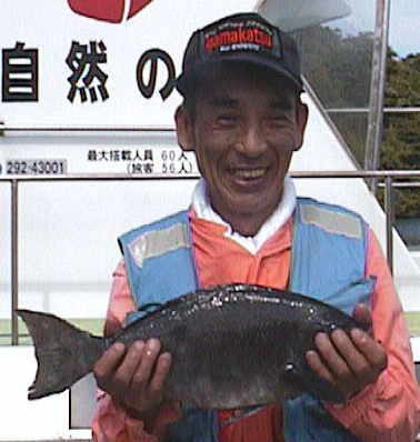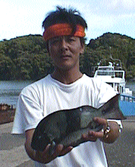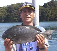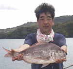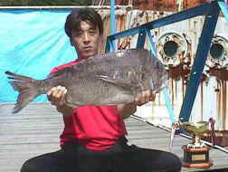 | 写真写りが悪くチヌのように見えますが れっきとしたマダイ3.3kgです。 西縁で山下さんが釣りました。 |