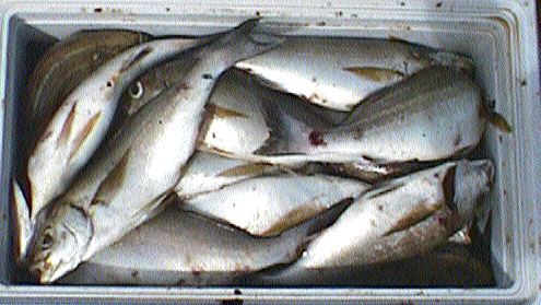 西瀬4番で釣った山野さんのクーラー 大型のクロがイサキに混じっています。 |