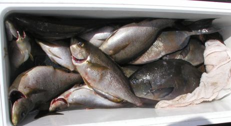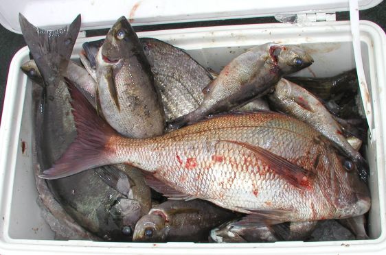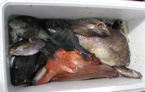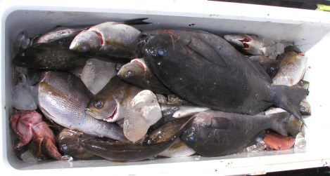 小立島東の沢田さんのクーラーです。イサキ、クロが大漁でした。 |