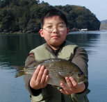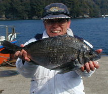 | チヌが今年は良く釣れています。岩下さんは小立南の東で2kgオーバーをゲット。 | 本田さんは大立東の北で2kgオーバーのチヌを2枚釣っていました。本日はマダイの当たりはなかったみたいです。 |
