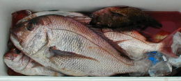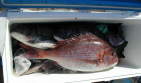 | 今週の大物賞は前村さんが釣り上げた3.4kgでした。大立西の北でたくさんのマダイを釣っていましたよ。 | 前村さんのクーラーです。 5枚のマダイとアラカブ、チヌが入っていました。 |