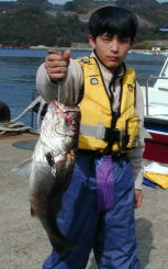 | 久しぶりに降りることができた小立北での津川さんのチヌです。2.8kgの大物でした。 | 谷川君は今日も大物賞でした。マダイ2.0kgとスズキ2.8kgをゲット。ポイントは大立南です。 | 谷川君のスズキです。最近はマルスズキも釣れるようになってきました。 |