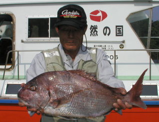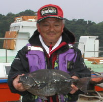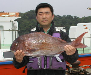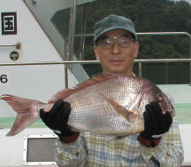 | 井上さんが釣った4.4kgです。ポイントは中瀬2番。 | 長下さんは大立西の北で3.9kgをゲット。マダイは3枚釣っていました。 |