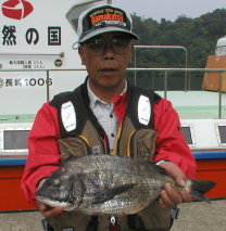 | 1.7kgのチヌを釣った岩下さん。大立南のハナレでイサキも結構釣っていました。 | 同じく南のハナレの国武さんが釣った1.6kgのクロです。 | 坂本さんは西ブチで3.2kgの良型をゲット。 |