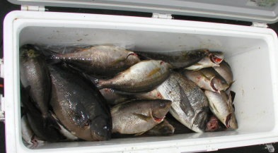| イサキの良型に混じって1.6kgのクロを釣った田中さんです。はるばる飛行機で東京からやってきました。 | 田中さん、前川さんのクーラーです。一番のイサキは1kgを超えていました。 |