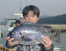 | どこでも釣ってしまう本田さんは広場でマダイとコロダイを釣りました。 | 立派なクロ1.55kgです。杉原さんが大立東のハナレで釣りました。 | 千住さんは小立南の東2番でクロ、イサキを沢山釣っていました。一番の大物は1.55kgでした。 |