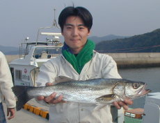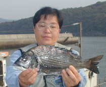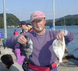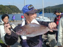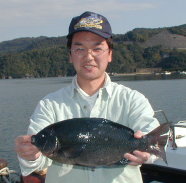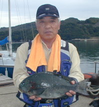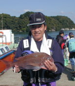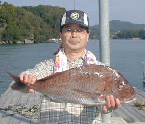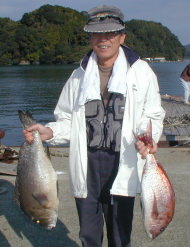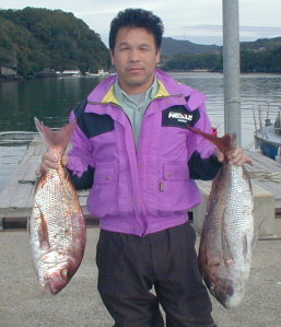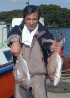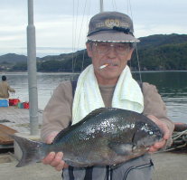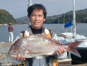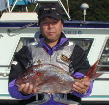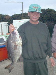 | 小立の南の東2番で昼間からクロが当たって来たという岩井さんです。キロオーバーを2枚釣っていました。 | 岩井さんはマダイもごらんのとおり。 2kgちょうどでした。 |