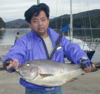 | この季節としては大物マダイ2枚を釣った前田さんです。ポイントは大立西の北2番で4.9kgと3.5kgありました。 | 大立西の向かいでコロダイ3.6kgを釣った副島さんです。秘訣はマダイよりもさらに棚を深くすることだそうです。 |