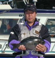 | 本田さんは1.55kgの大物クロを釣っていました。ポイントは大立西のハナです。 | 今回好調だった石川さんの一番はコロダイ3.2kgでした。ポイントは西瀬2番。 | 関さんは沢山のクロを中瀬3番で釣っていましたが、一番は1.35kgでした。 |