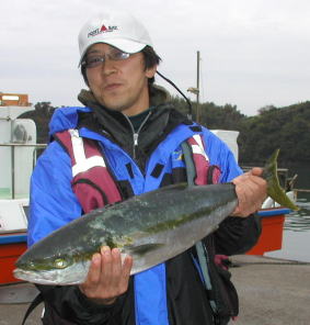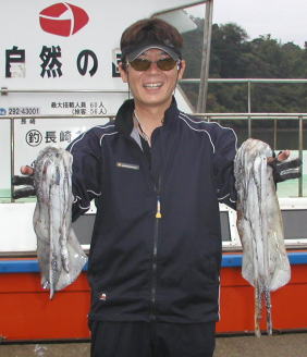 | 稗田さんは先週に続き高瀬でミズイカを釣っていました。それにしても大きい! | 照れ屋の山野さんに代わっての写真撮影は小川さんです。 西瀬4番でゲットした5kg弱のヒラスです。 |