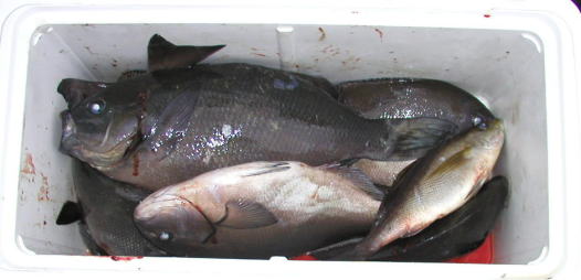 | 写真上 樋口さんが釣った1.7kgの良型クチブトです。 写真右上は樋口さんのクーラーでキロオーバーが5枚ほど入っていました。ポイントは大立島南の横2番。 写真右下は大立島南でキロオーバーを8枚釣った本田さんの クーラーです。スゴイ。 |