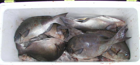 写真上 大立島西のハナで60cmのイシダイと3.8kgのマダイを釣った田代さんです。 写真下 小立島南の東で良型を2枚釣っていた力武さんのクーラーです。 |