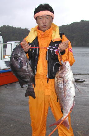 | 3kgのマダイを釣った麻生さんです。ポイントは大立島東のハナレです。 | 牟田さんのマダイは2.3kgです。高瀬2番で風にも負けずに頑張りました。 |