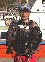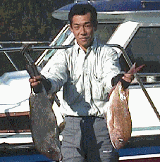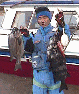 | 底物師栗原さんのイシダイです。 2.4kgと1.9kgでした。 右手にもつのは友達が釣った 2kgのイシダイ。 ポイントは小立の南の東です。 |