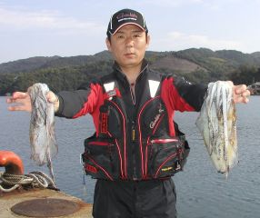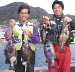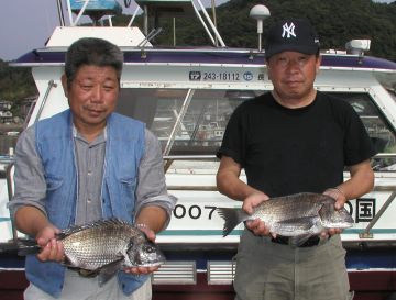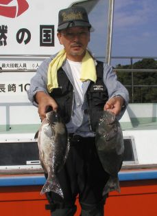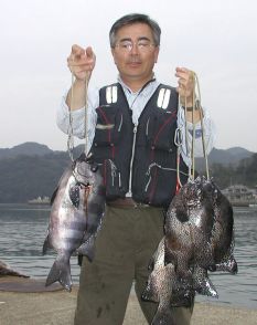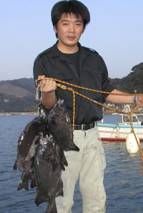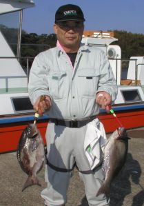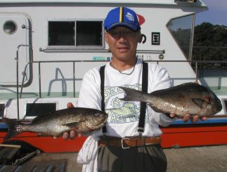 左手のクロ1.3kgと右手のイサキ0.7kg 小立島南、清原さんです。 |