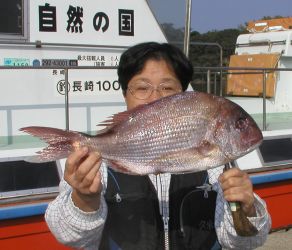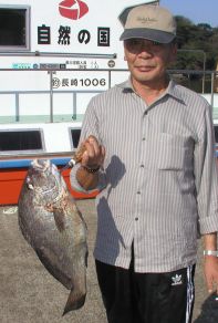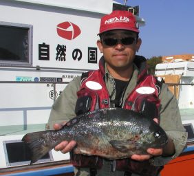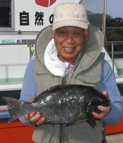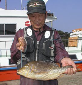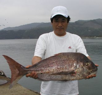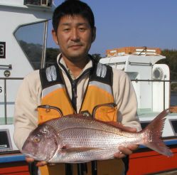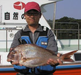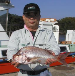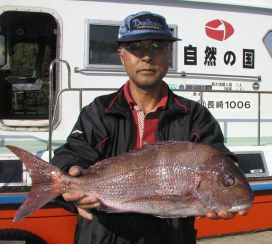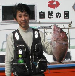 数少ないマダイを釣った久米さん。中瀬3番でした。 |