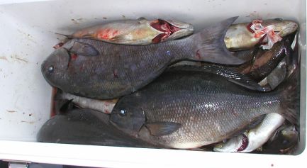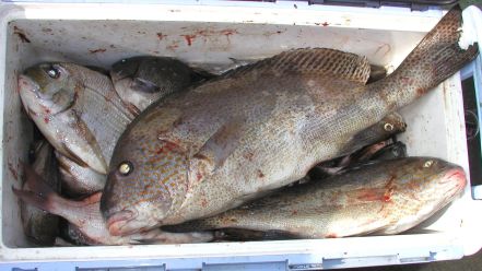 チヌは朝の上げ潮が良かったようです。1.4kg、1.3kgなり。 |
